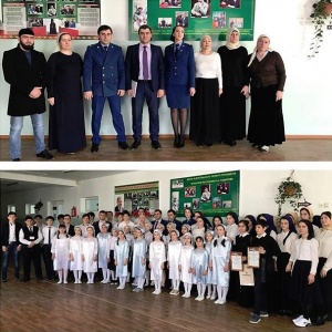 Плахотник Альбина Владимировна, Цацаев Апти Джунидович - главный специалист - эксперт отдела семейной политики и социальной защиты детства Министерства Молодежи ЧР. На мероприятии награждены учащиеся нашей школы Исраилова Раяна и Магомадов Хамид, которые заняли первые места в городском конкурсе -эссе "День Защитника Отечества"