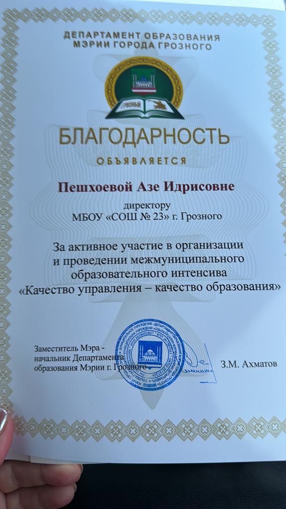 02.06.2023Департамент образования Мэрии г. Грозного объявил благодарность директору МБОУ «СОШ № 23» г. Грозного Пешхоевой Азе Идрисовне за активное участие в организации и проведении межмуниципального образовательного интенсива «Качество управления - качество образования».