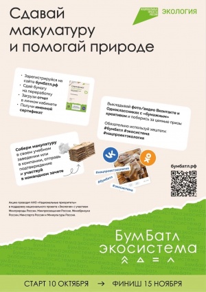 «Акция "БумБатл" традиционно проводится в поддержку нацпроекта "Экология". Присоединиться к проекту может каждый – как самостоятельно, так и в составе организаций. Помощь в сборе и переработке макулатуры проекту окажут представители ключевого регионального оператора. Как и в прошлом году, мы надеемся увидеть в числе участников тысячи воспитанников детских садов, школ, колледжей, вузов, а также представителей частных компаний, заинтересованных в сохранении природных ресурсов», – отметила генеральный директор АНО «Национальные приоритеты» София Малявина.
