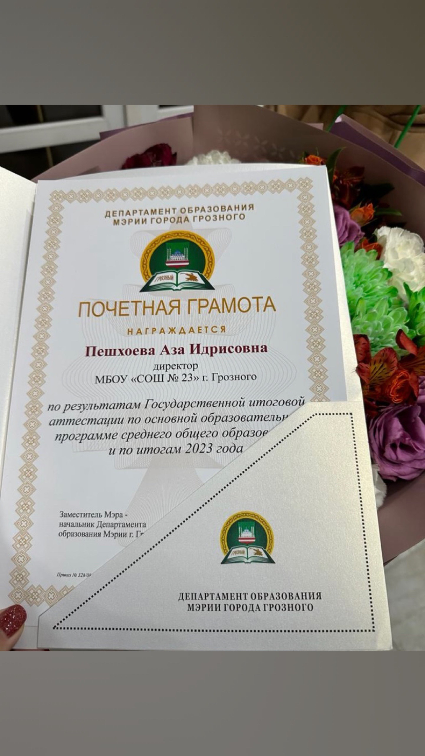 Награждение директора МБОУ «СОШ № 23» г. Грозного Пешхоевой Азы Идрисовны на заседание коллегии.Дала т1аьхье беркате йойла❤️ Лучший директор ❤️