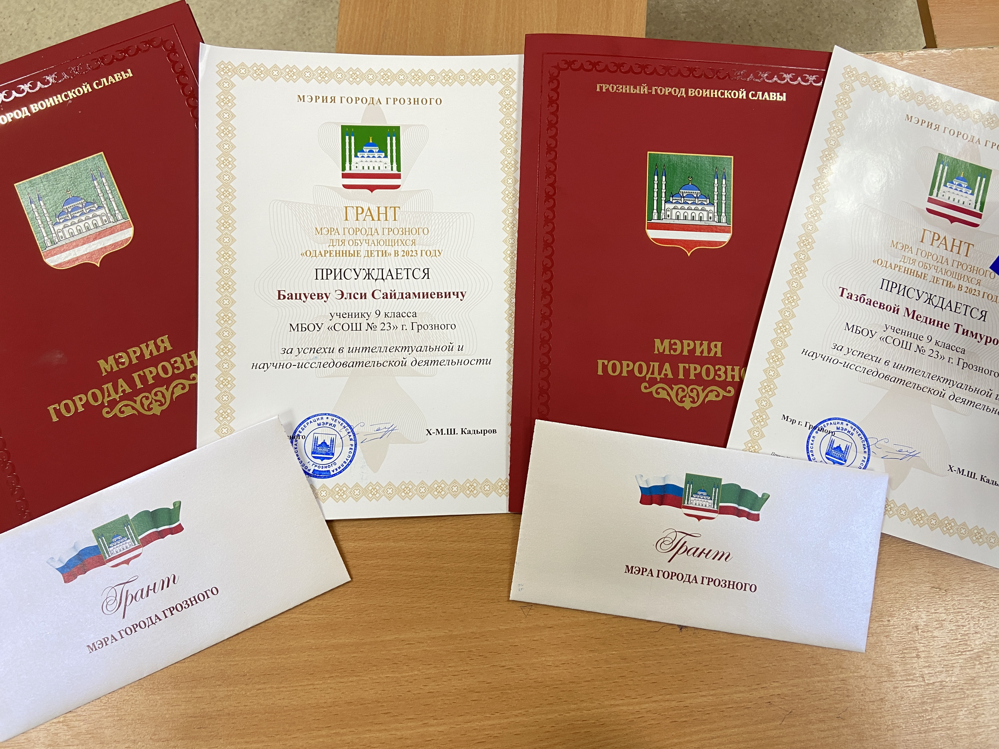Учащиеся 9 «Б» класса МБОУ «СОШ № 23» г. Грозного Бацуев Элси и Тазбаева Медина стали обладателями Гранта Мэра г. Грозного "Одаренные дети-2023" за успехи в интеллектуальной и научно-исследовательской деятельности.