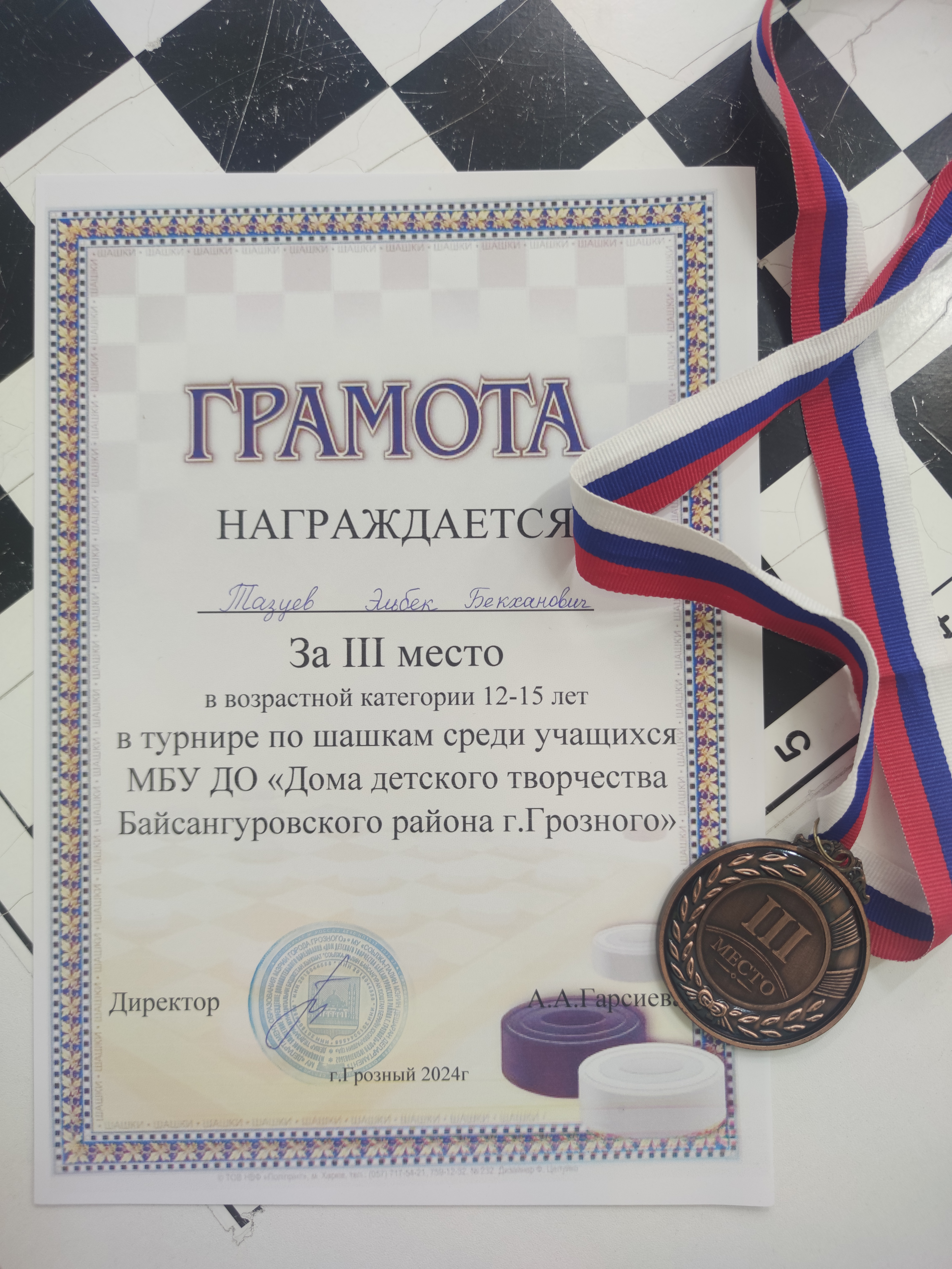 6 февраля 2024 г. учащиеся МБОУ «СОШ № 23» г. Грозного Тазбаева Медина (9б класс), Тазуев Магомед-Амин (3в класс), Тазуев Эльбек (9б класс) приняли участие в турнире по шашкам среди учащихся МБУ ДО «ДДТ Байсангуровского района г. Грозного», где Тазуев Эльбек занял 3 место в возрастной категории 12-15 лет.