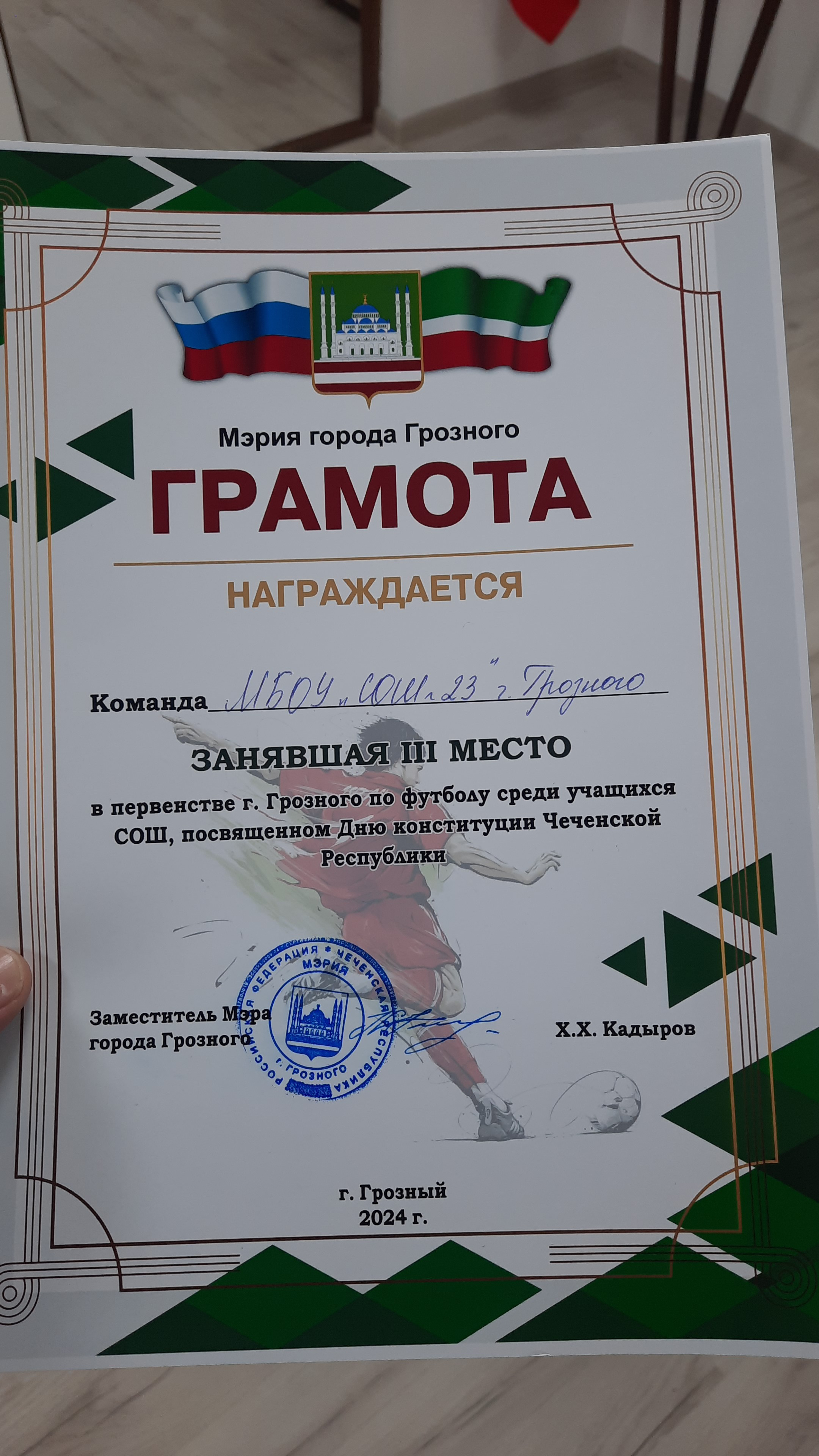 21 марта 2024г. футбольная команда МБОУ «СОШ № 23» г. Грозного заняла 3 место в первенстве г. Грозного по футболу среди учащихся СОШ, посвящённом Дню Конституции ЧР.