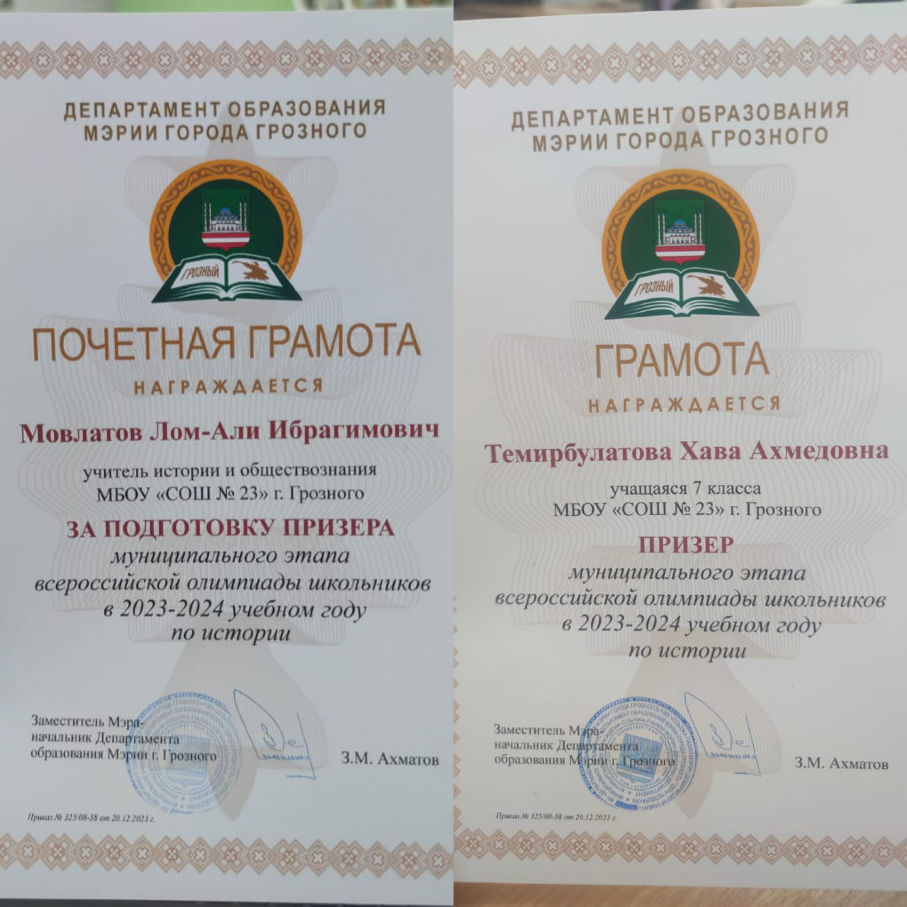 Также почетной грамотой от @depobr_grozny награждён Мовлатов Лом-Али Ибрагимович, учитель истории и обществознания МБОУ «СОШ № 23» г. Грозного, за подготовку призёра муниципального этапа всероссийской олимпиады школьников в 2023-2024 учебном году по истории.