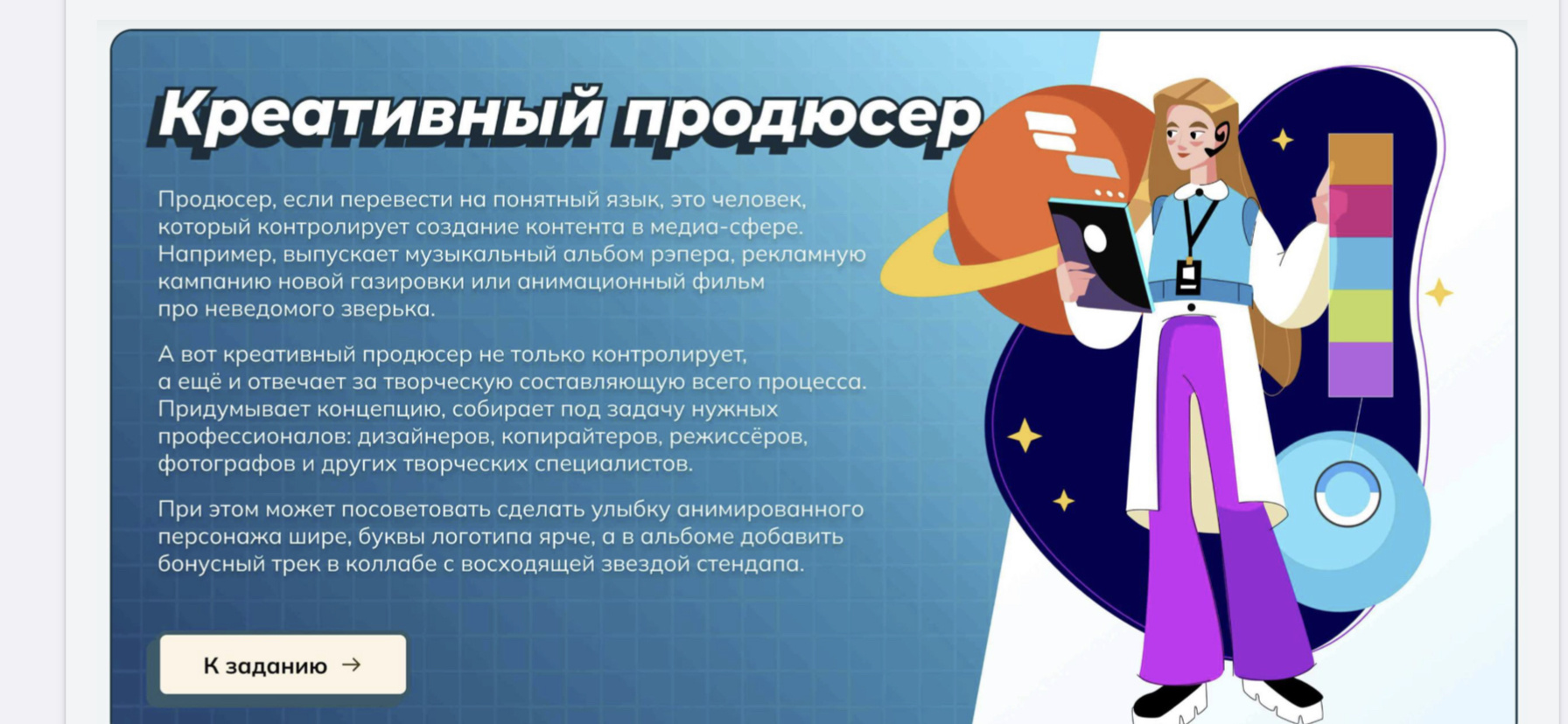 Тема занятия: «Пробую профессию в креативной сфере» (симулятор профессии на платформе проекта «Билет в будущее»).