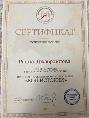 Учащиеся 10 класса МБОУ «СОШ № 23» г. Грозного, Джабраилова Раяна и Баталов Саламхан приняли участие в дистанционном тестировании, по итогам которого прошли в следующий этап историко-просветительского мероприятия «КОД ИСТОРИИ».