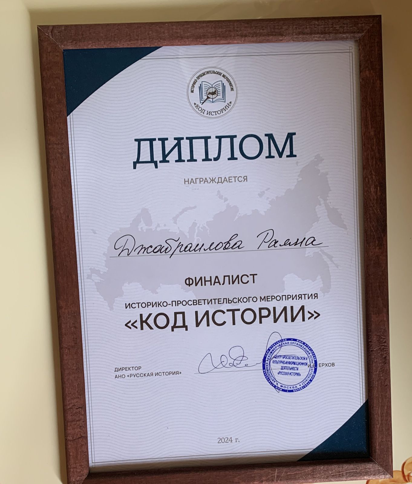Ученица 10 класса МБОУ «СОШ № 23» г. Грозного, Джабраилова Раяна, стала финалистом во всероссийском этапе историко-просветительского мероприятия «КОД ИСТОРИИ».