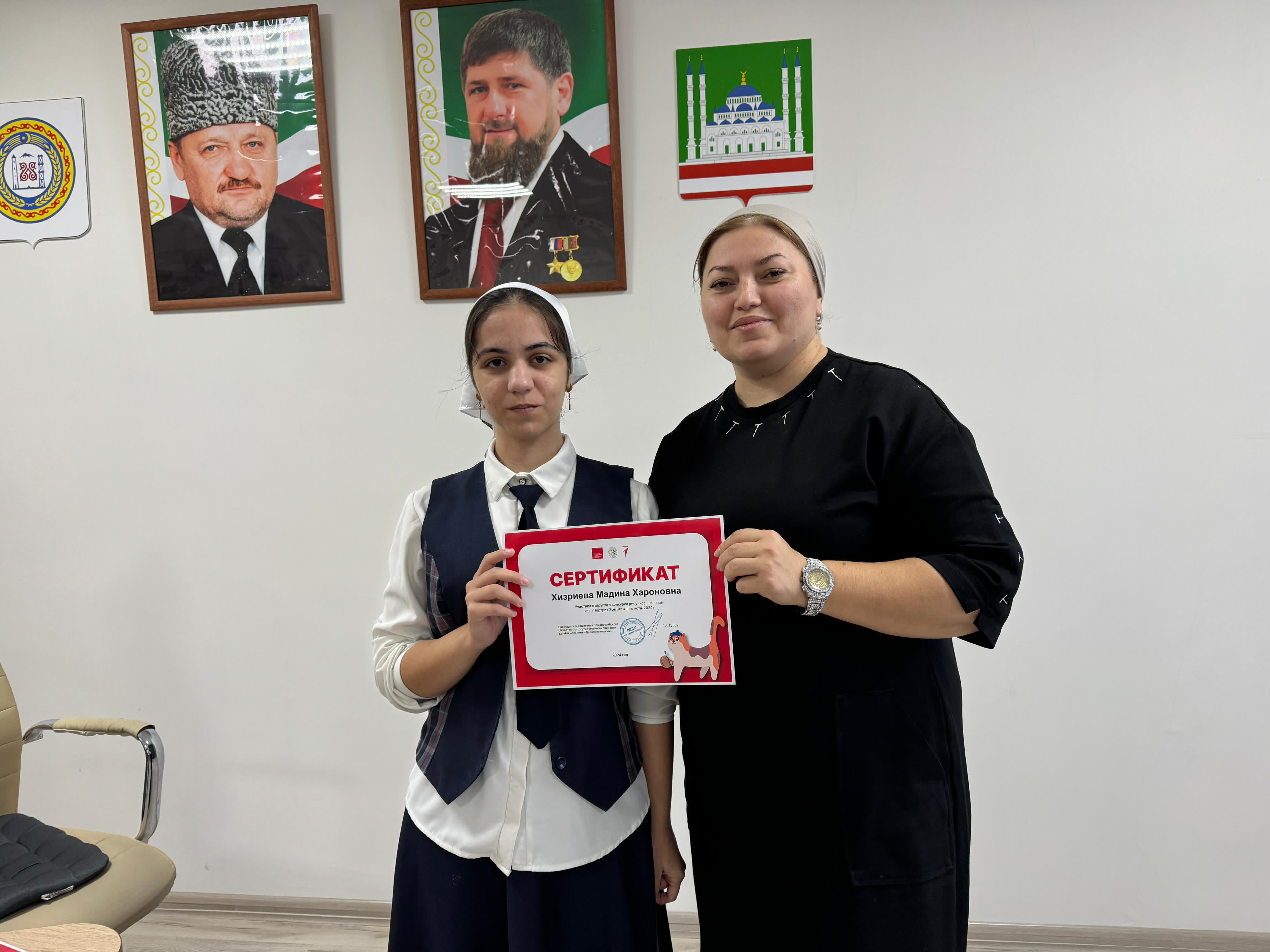 Также награждена ученица 10 класса Джабраилова Ремиса за активное участие во Всероссийской художественной выставке городов воинской славы «Дети рисуют мир».