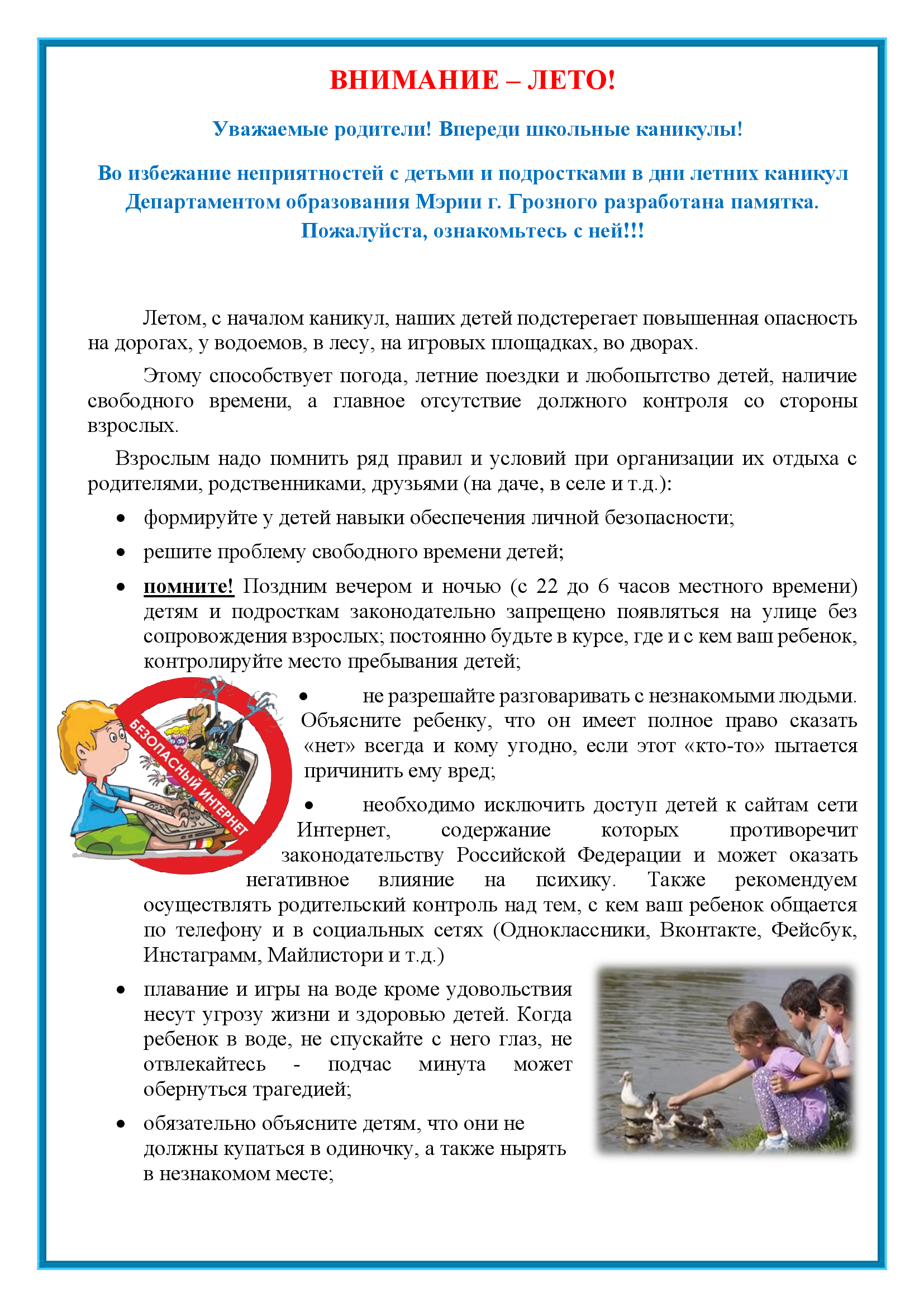Во избежание неприятностей с детьми и подростками в дни летних каникул Департаментом образования Мэрии г. Грозного разработана памятка. Пожалуйста, ознакомьтесь с ней!!!